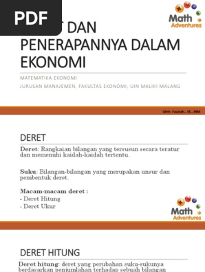 Soal Deret Ukur Matematika Ekonomi : Materi Matematika Bisnis Ppt Download : Apabila a adalah suku pertama suatu baris (u1) dan r adalah rasio antara dua suku yang berurutan maka sesuai dengan pengertian deret ukur. 3 deret hitung dan deret ukur.pdf (699kb). Berikut pembahasan contoh soal deret geometri dalam ulasan yang mudah dipahami sehingga dapat meningkatkan pemahaman dalam matematika. Matematika ekonomi semester gasal 2010/2011. Materi matematika sma ini sering muncul dalam berbagai bentuk soal. Nodul praktikumnateri himpunannatek 1 hal.